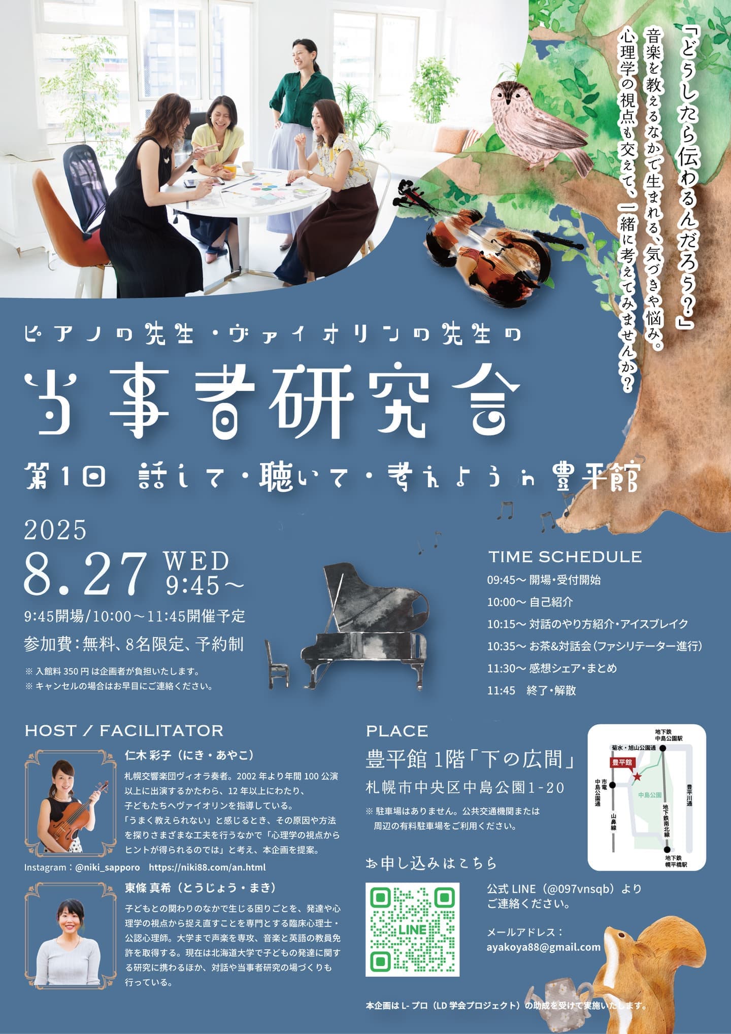 - 札幌交響楽団ヴィオラ奏者。2002年より年間100公演以上に出演するかたわら、12年以上にわたり、こどもたちへヴァイオリンを指導している。「うまく教えられない」と感じるとき、その原因や方法を探りさまざまな工夫を行うなかで、「心理学の視点からヒントが得られるのでは」と考え、本企画を提案